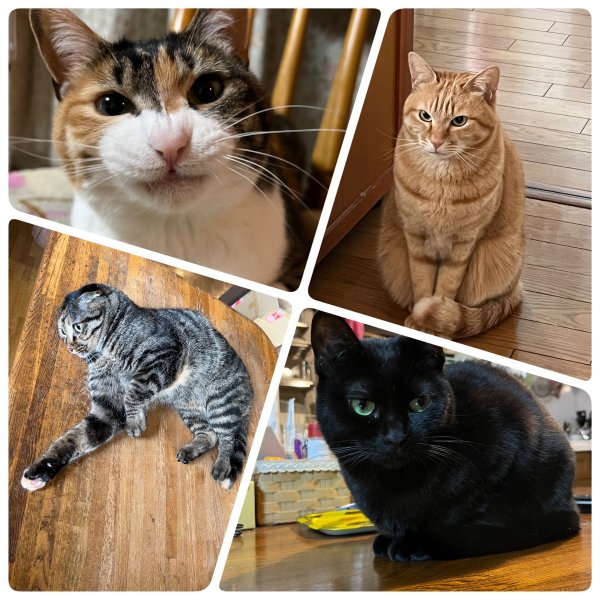 勤務時間がマチマチ、気分次第、そしてよく寝ています。近頃はお客様の声につられて、店番にやってきます。新人の茶トラ、ホク♂(8歳?)が家族になり、そして町内のノラ猫だった黒猫のノアール♀(5歳?)が仲間入り。いちだんとにぎやかになっています。